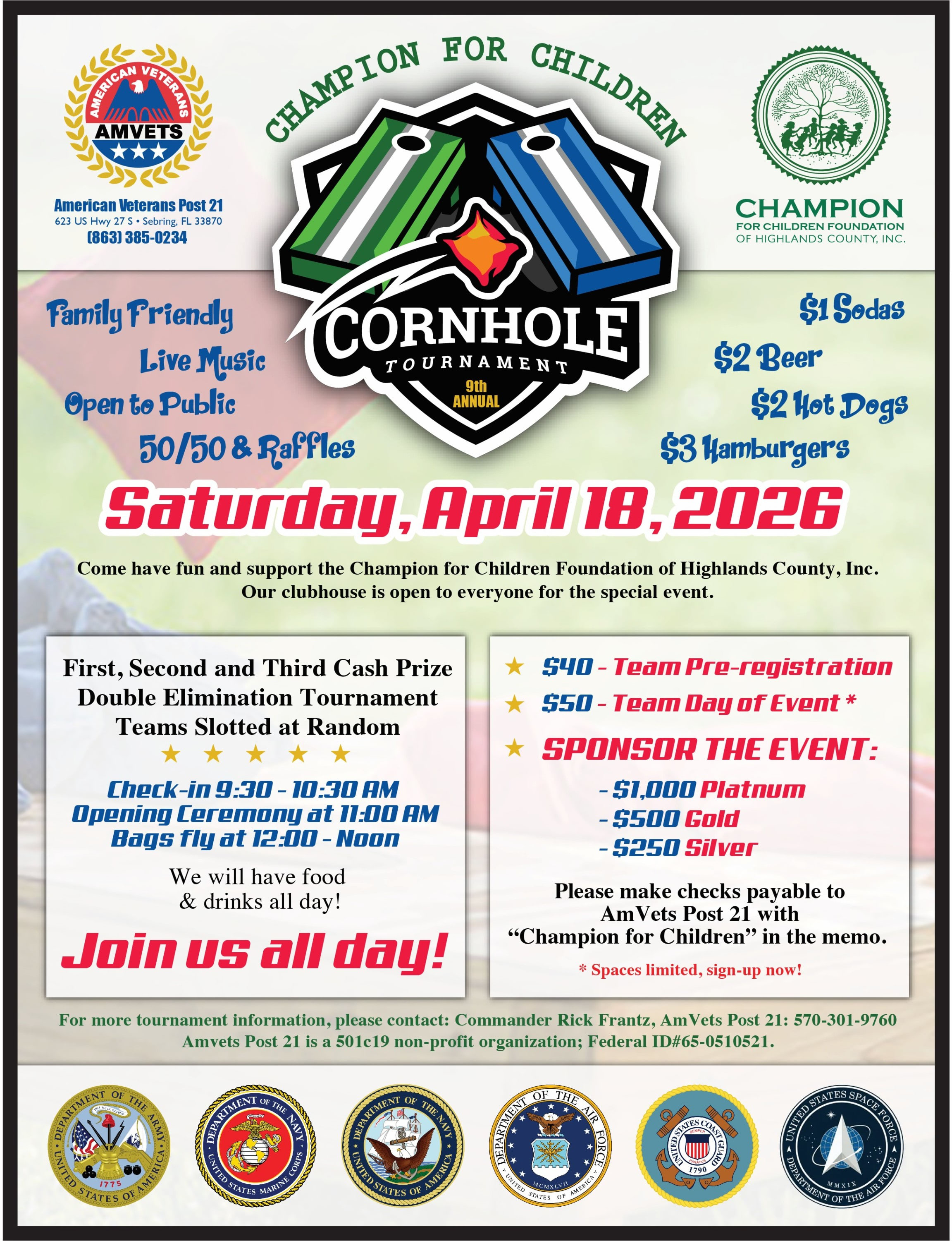 Come have fun and support The Champion for Children Foundation of Highlands County, Inc. Our clubhouse is open to everyone for the special event.Images