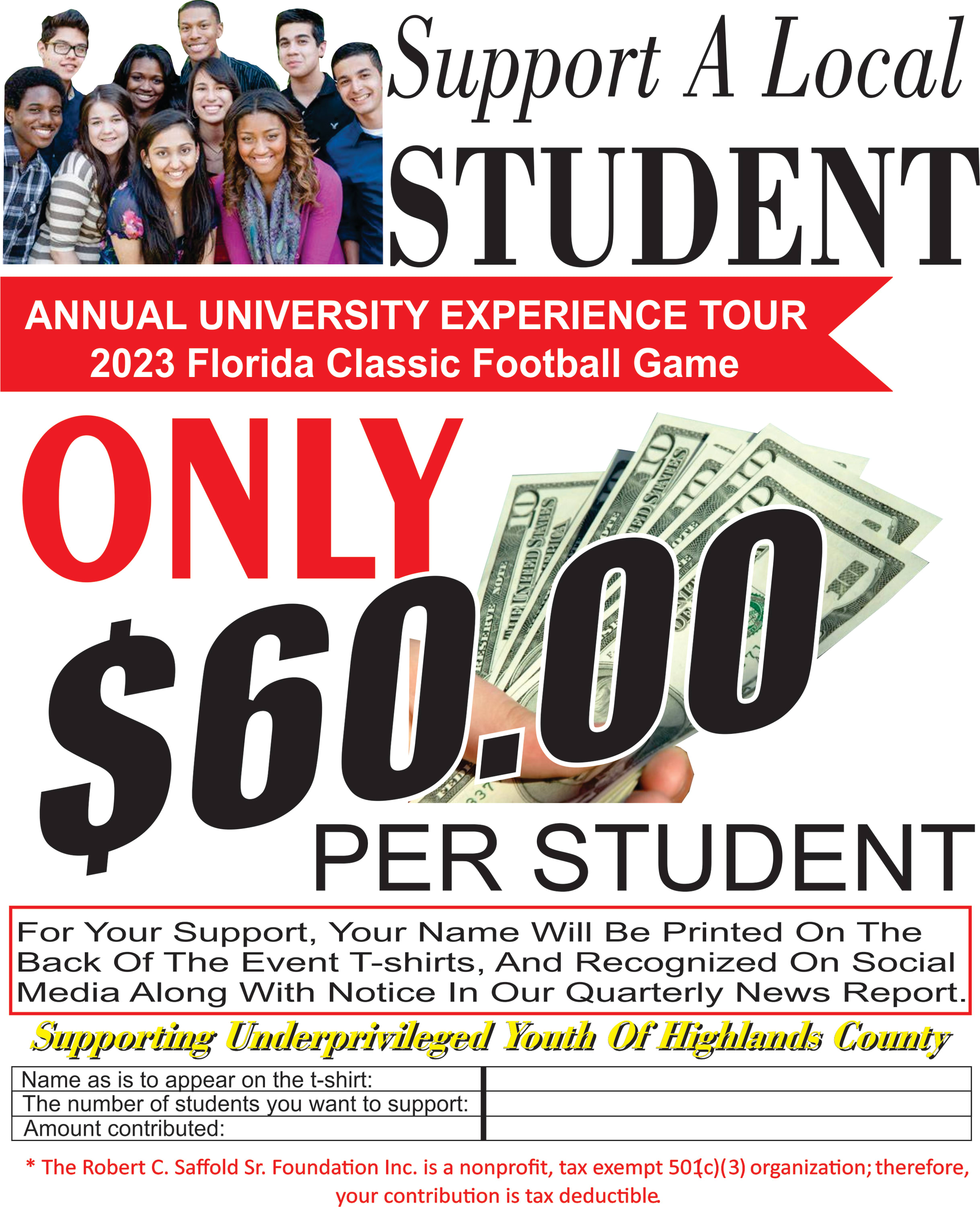 The Robert C. Saffold Foundation is taking 50 students from each highschool on a University Experience tour! Each student that attends will have the oppotunity to attend a foodball game, tour dorm rooms, attend a mock lecture and experience what college is. This event supports underprivledged students who would not be able to tour facilities themselves or with their families.Images