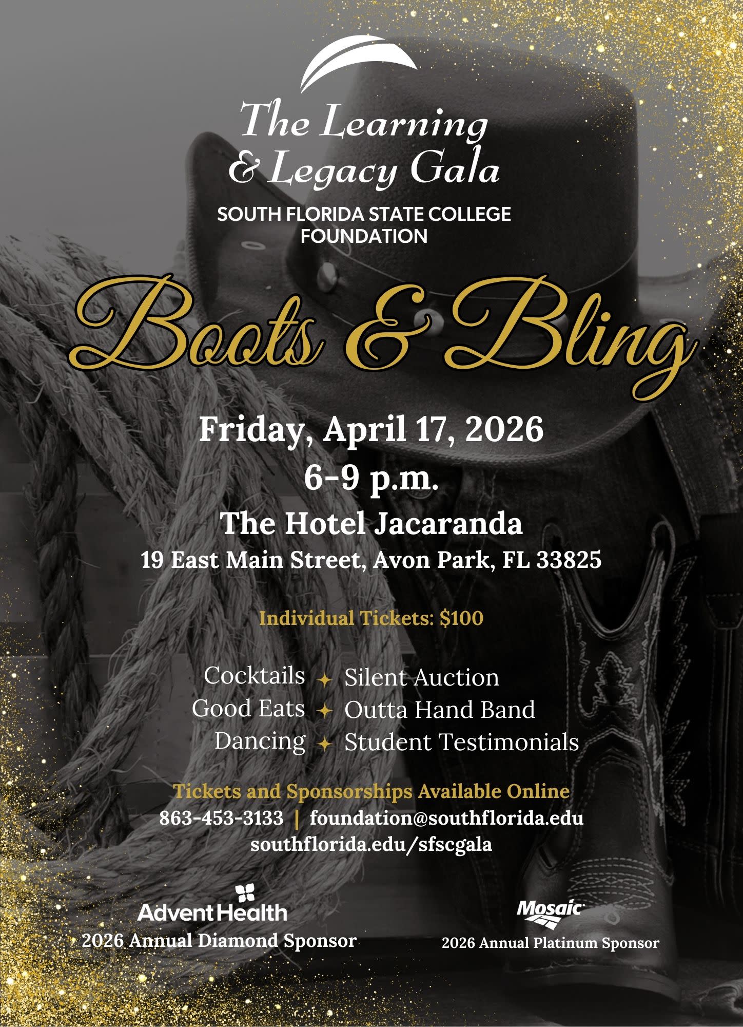 Dust off your boots and shine up your bling. You are invited to the Second Annual Learning and Legacy Gala supporting the SFSC Foundation as we Build for the Future for our students and the college. Come and enjoy the evening with fellow supporters and friends of the community while tantalizing your tastebuds with heavy hors d’oeuvres, beer and wine as we dance the night away with the tunes from the Outta Hand Band. There will be a silent auction, interactive learning with students, and more for you to enjoy.