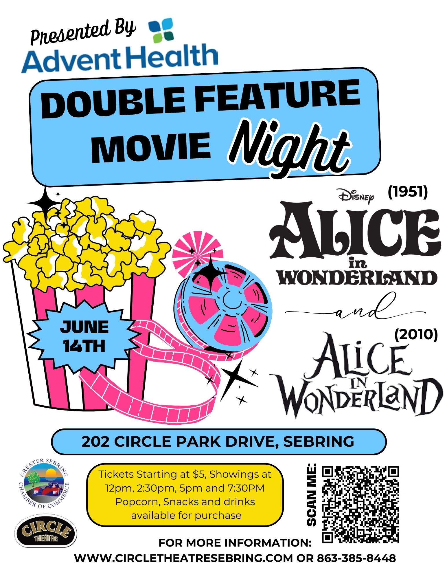 Join us for a double feature movie night with Alice in Wonderland presented by Advent Health! Original movie showing at 12PM and 5pm The 2010 remake showing at 2:30PM and 7:30pm. Popcorn, snacks and drinks available for purchase. Family 4 packs and double feature tickets at a discounted price. Tickets: https://www.eventeny.com/events/doublefeaturemovienightpresentedbyadventhealth-12369/Images