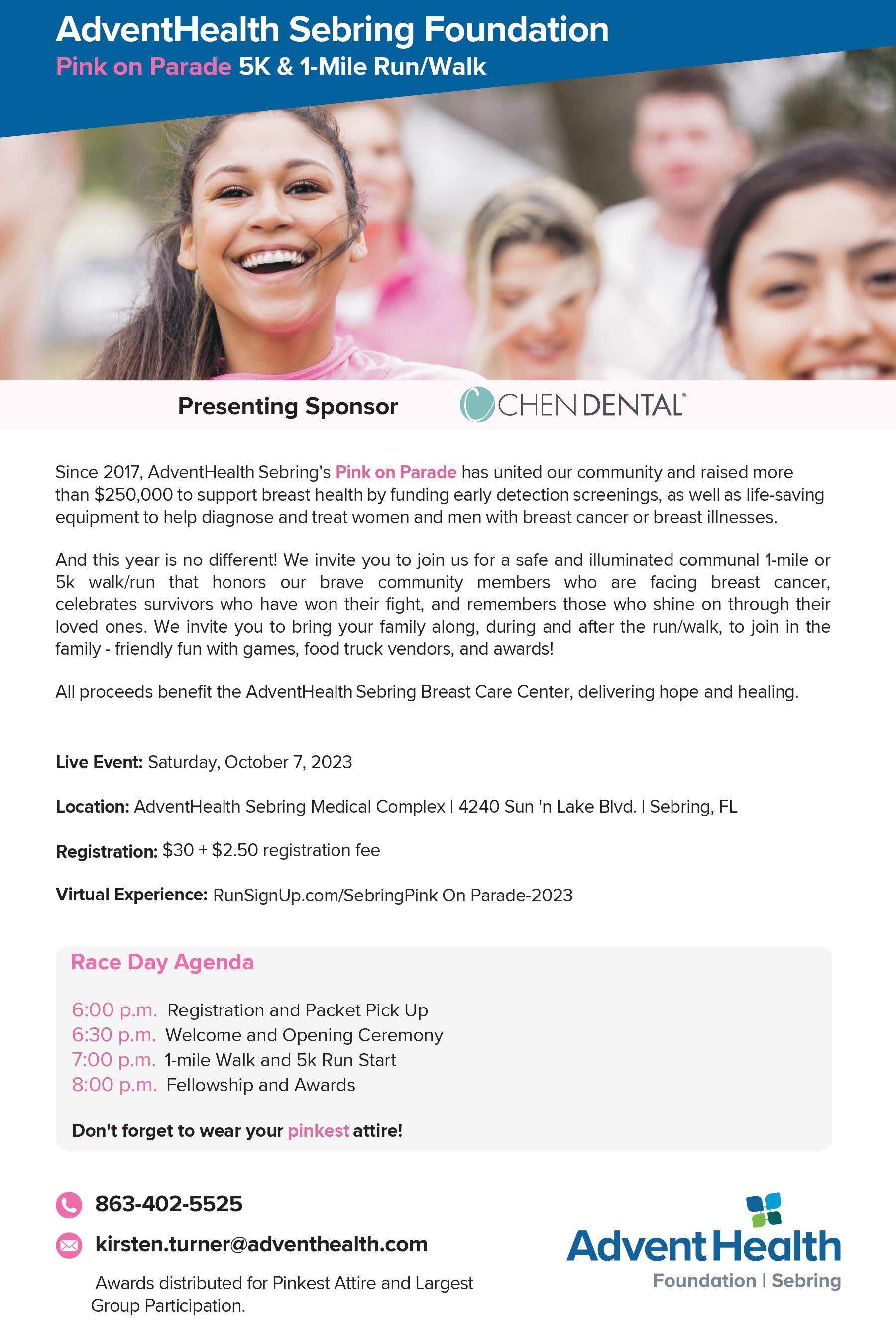 Join us, Saturday, October 7, 2023 for the AdventHealth Sebring Foundation Pink On Parade 5K and 1 Mile run/walk, presented by Chen Dental!