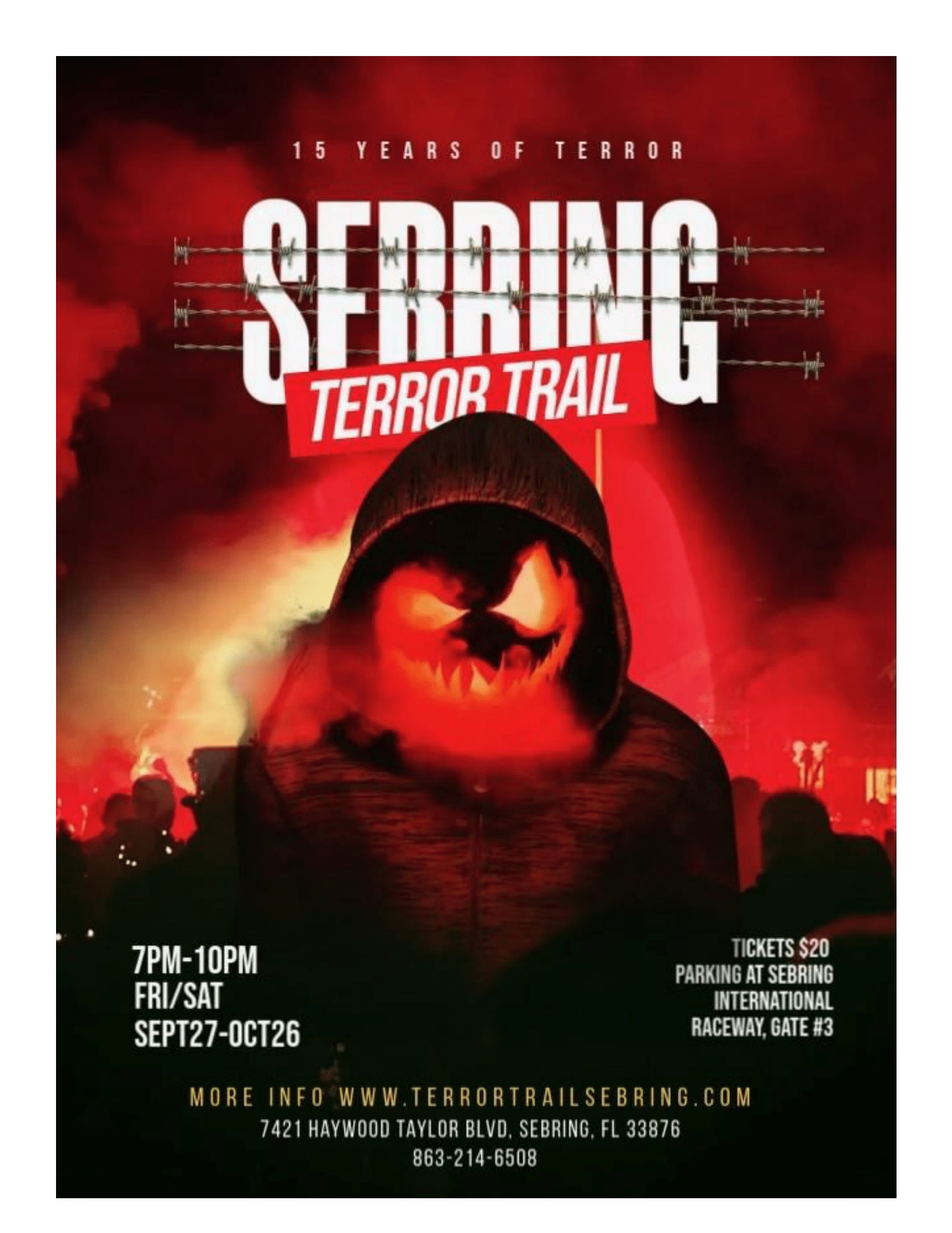 Ready to start Screaming? Terror Trail Haunted Attraction is open tonight! Tickets are $20 per person and parking is available at Sebring International Raceway, Gate #3. Open from 7pm - 10pm. Visit www.terrortrailsebring.com for more information.Images