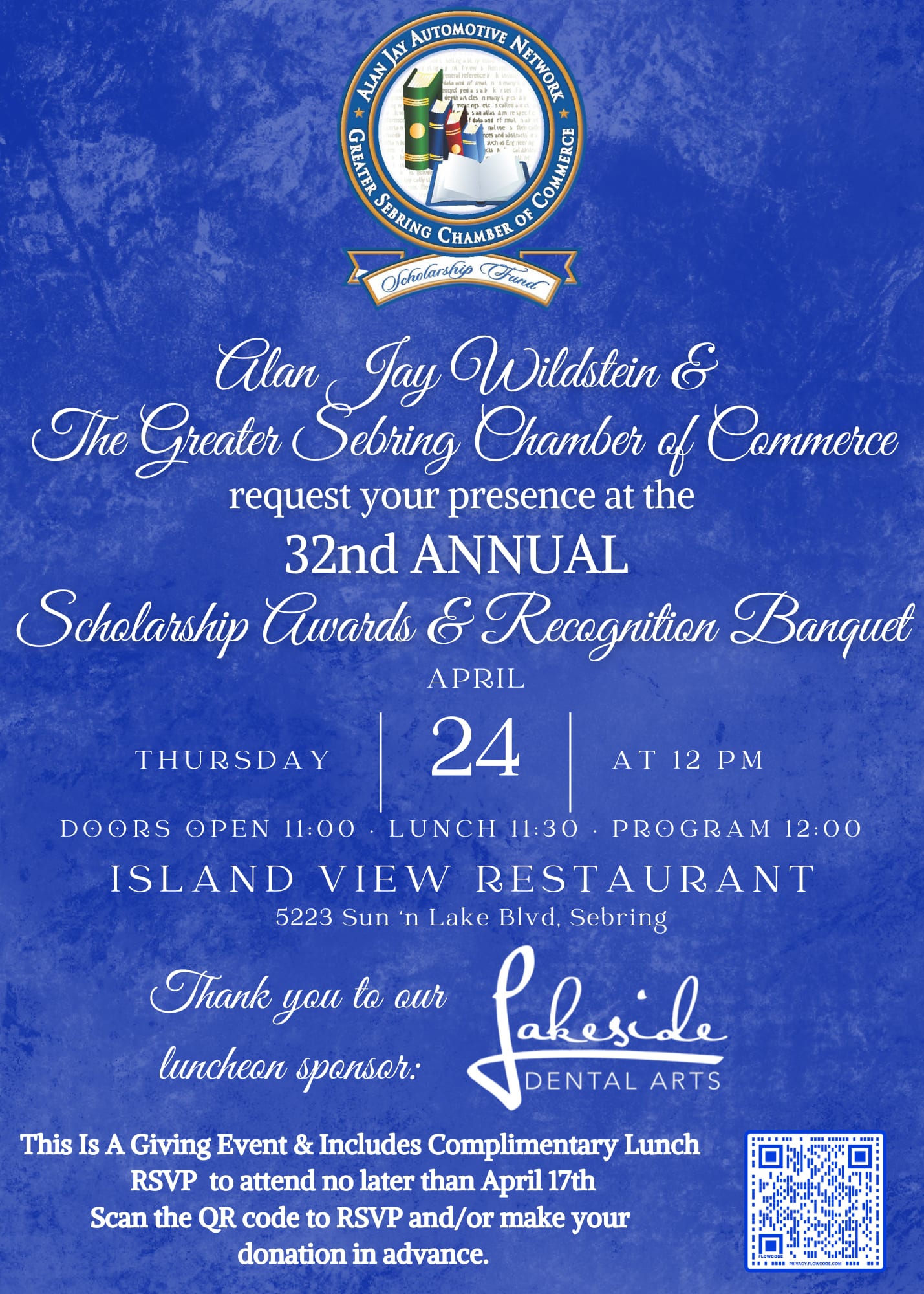 Thank you for supporting the Alan Jay Automotive Network and Sebring Chamber Scholarship! This is our 32nd year!! Please be sure to register to attend in person OR select not attending but would like to make a donation.
