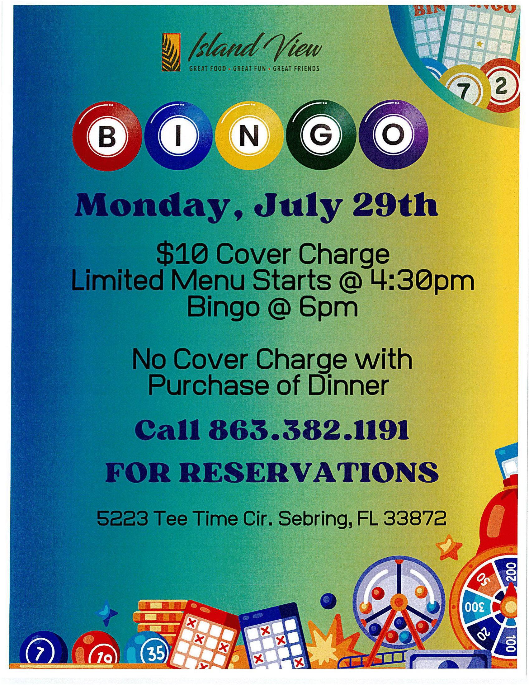 $10 cover charge. Limited Menu starting at 4:30pm. Bingo starts at 6pm NO cover charge if you purchase a dinner entree. RSVP by calling 863-382-1191