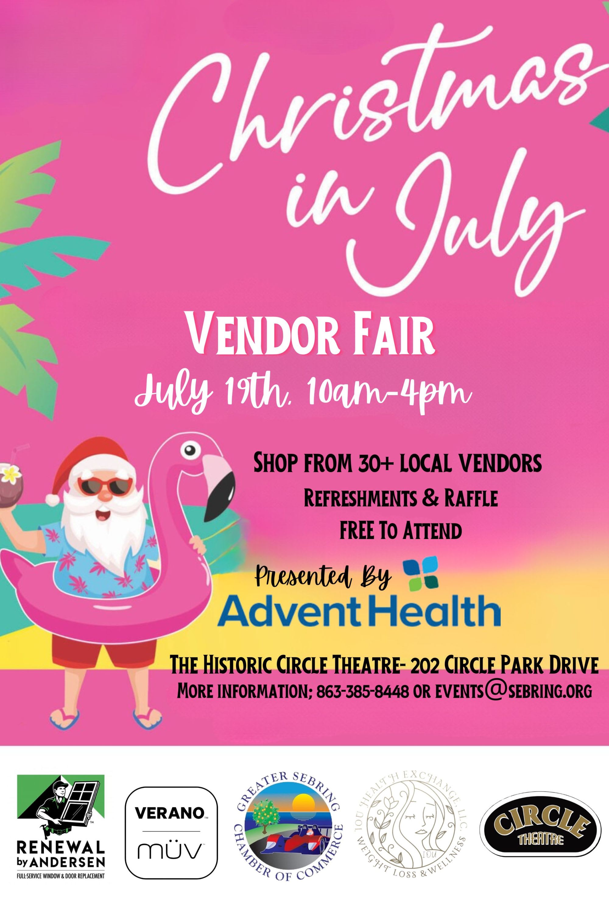 Christmas in July vendor fair presented by Advent Health at the Historic Circle Theatre! The event will take place July 19th, 10am-4pm indoors and is free to the public to attend! Shop with 30+ local vendors, plus raffles.