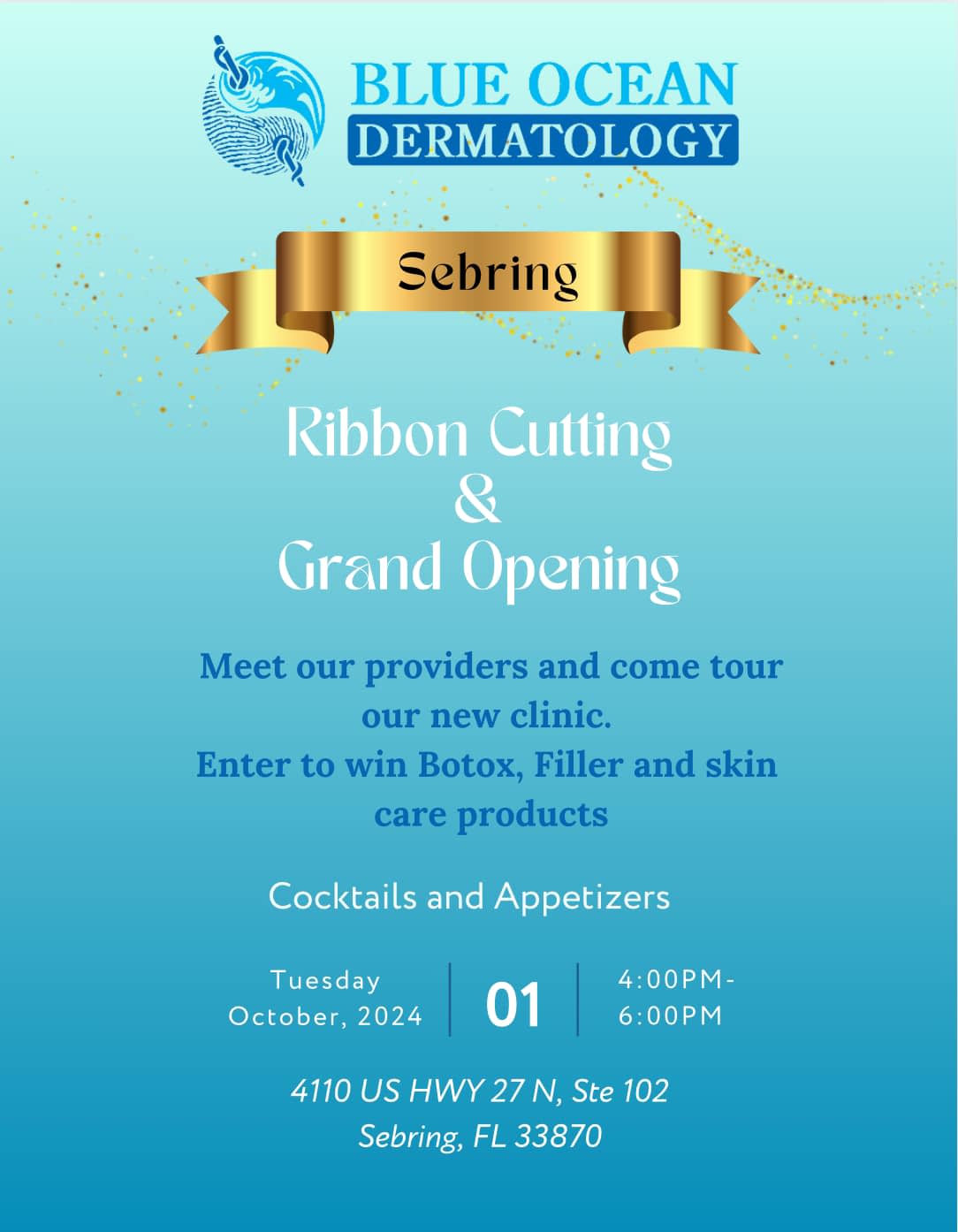 Come celebrate with Blue Ocean Dermatology for their grand opening and take a tour of their new clinic! They will have some great giveaways with apps and cocktails. 4110 US HWY 27 N Sebring FL