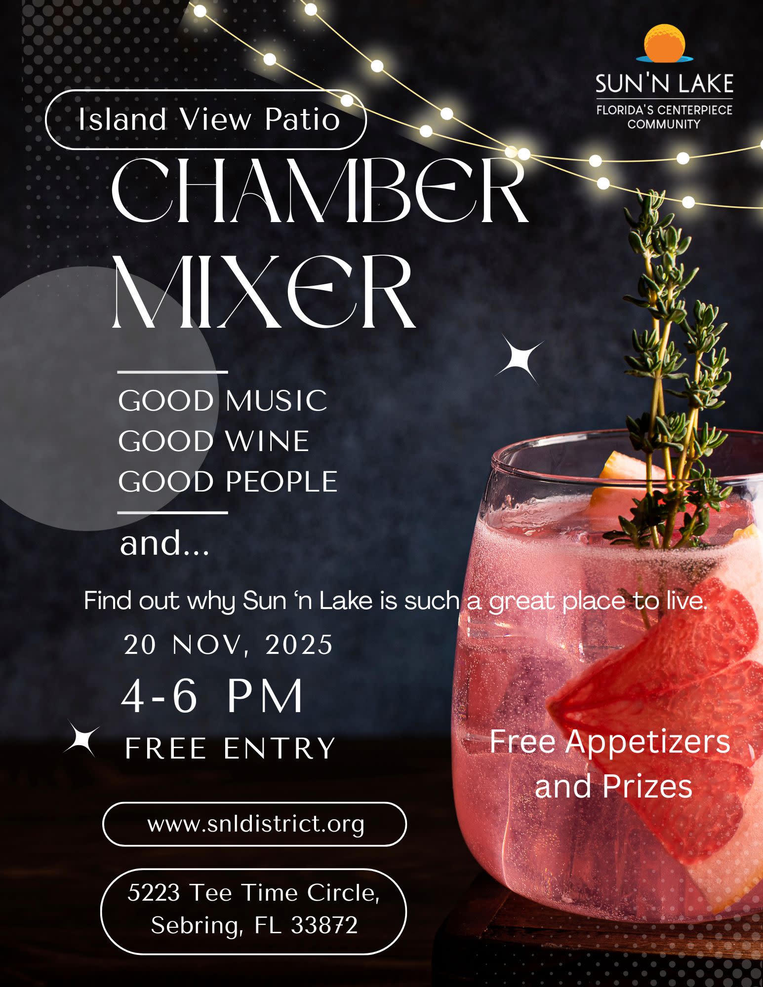 Join us November 20th from 4pm to 6pm at Sun N Lake Improvement District for the Monthly Mixer. Address: 5223 Tee Time Cir, Sebring, FL 33872