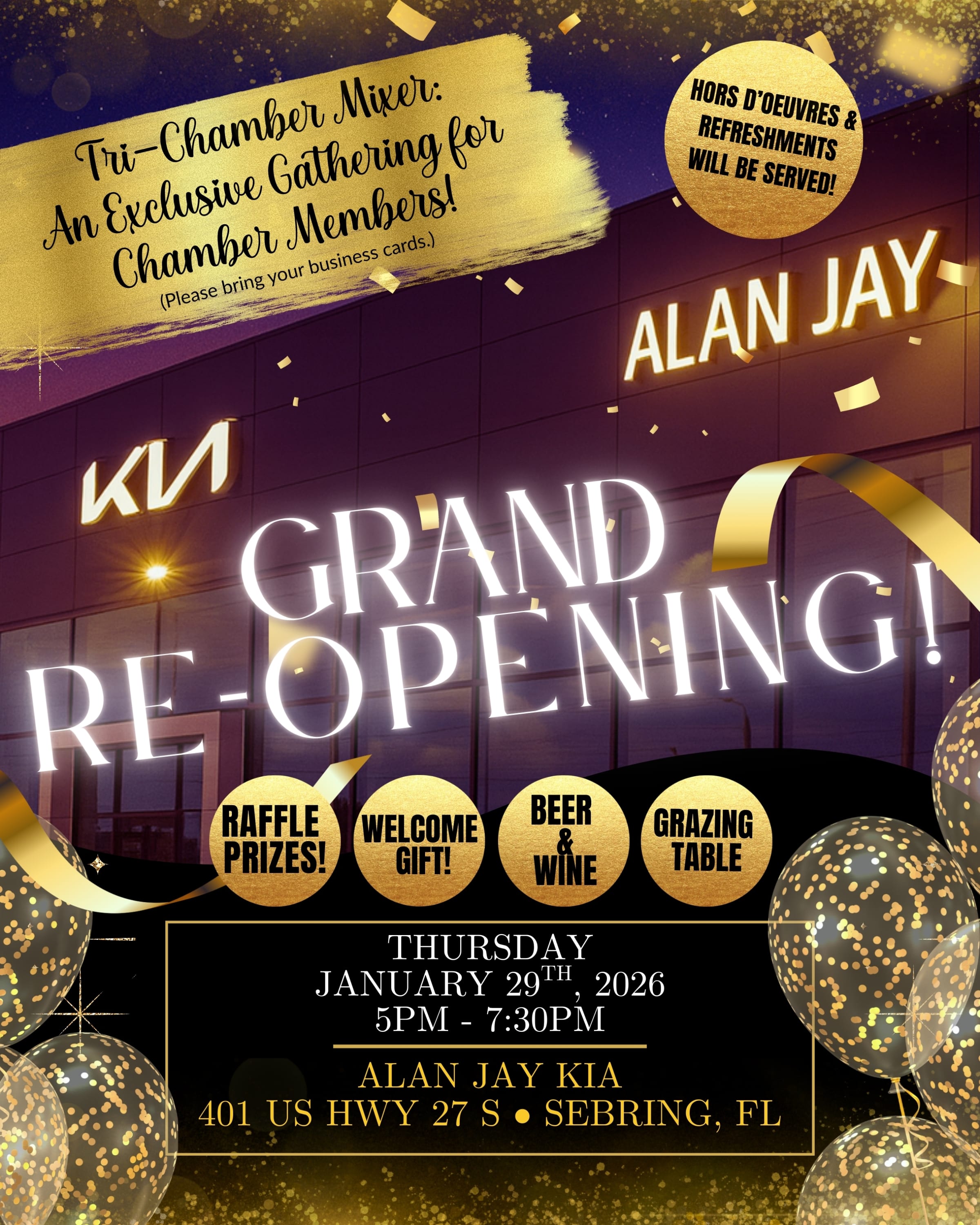 Chamber Members are invited to join us for the Grand Opening of Alan Jay Kia’s new showroom! Enjoy a beautifully curated grazing table and refreshments, and don’t forget to bring your business card for networking opportunities. This is a drop-in event—feel free to stop by anytime between 5:00–7:30 PM. 📍 Location: 401 US Hwy 27 S, Sebring We look forward to seeing you there!